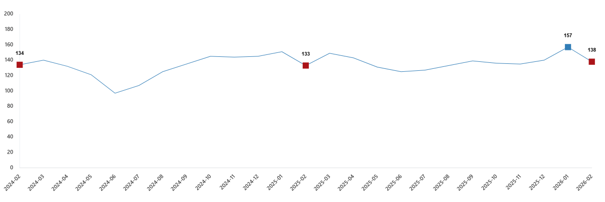 Bir önceki ay 157 bin 435 ton olan içme sütü üretimi Şubat ayında %12,3 oranında azalarak 138 bin 131 ton olarak gerçekleşti.