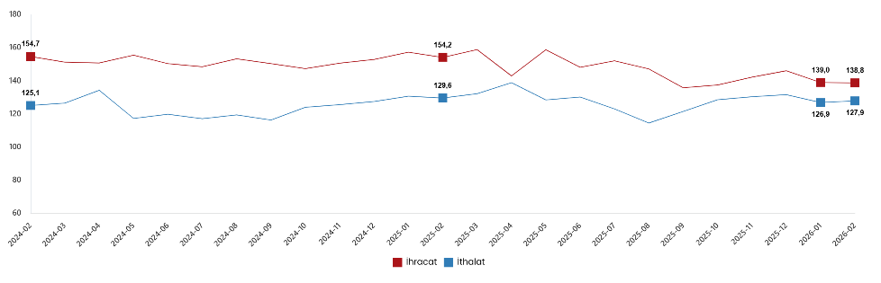 Mevsim ve takvim etkilerinden arındırılmış dış ticaret miktar endeksleri, Şubat 2026