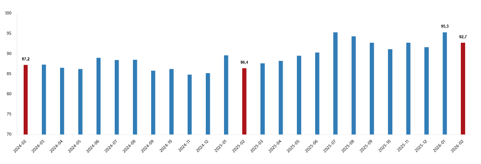 İhracat birim değer endeksinin ithalat birim değer endeksine bölünmesiyle hesaplanan ve 2025 yılı Şubat ayında 86,4 olarak elde edilmiş olan dış ticaret haddi, 6,3 puan artarak, 2026 yılı Şubat ayında 92,7 oldu.