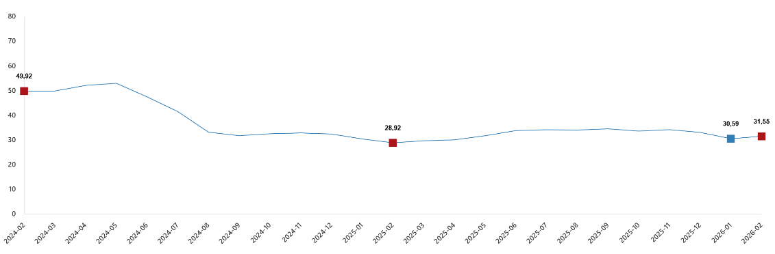 Tarım-GFE'de (2020=100), 2026 yılı Şubat ayında bir önceki aya göre %3,10 artış, bir önceki yılın Aralık ayına göre %7,08 artış, bir önceki yılın aynı ayına göre %31,55 artış ve on iki aylık ortalamalara göre %32,64 artış gerçekleşti.
