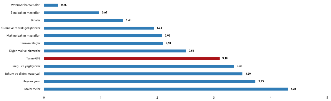 Ana gruplarda bir önceki aya göre, tarımda kullanılan mal ve hizmetler endeksinde %2,96 artış, tarımsal yatırıma katkı sağlayan mal ve hizmetler endeksinde %3,94 artış gerçekleşti. Bir önceki yılın aynı ayına göre tarımda kullanılan mal ve hizmetler endeksinde %32,81 artış, tarımsal yatırıma katkı sağlayan mal ve hizmetler endeksinde %24,31 artış gerçekleşti.