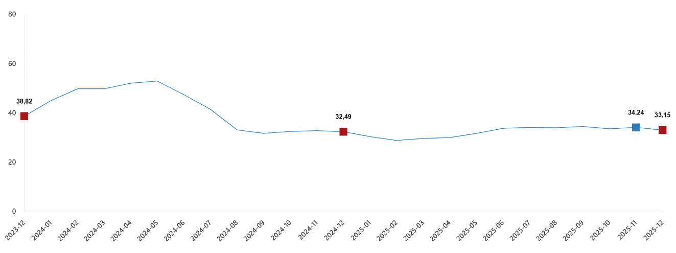 Tarım-GFE'de (2020=100), 2025 yılı Aralık ayında bir önceki aya göre %1,30 artış, bir önceki yılın Aralık ayına göre %33,15 artış, bir önceki yılın aynı ayına göre %33,15 artış ve on iki aylık ortalamalara göre %32,50 artış gerçekleşti.