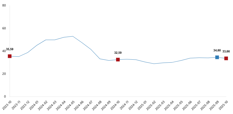 Tarım-GFE'de (2020=100), 2025 yılı Ekim ayında bir önceki aya göre %2,04 artış, bir önceki yılın Aralık ayına göre %29,06 artış, bir önceki yılın aynı ayına göre %33,66 artış ve on iki aylık ortalamalara göre %32,30 artış gerçekleşti.