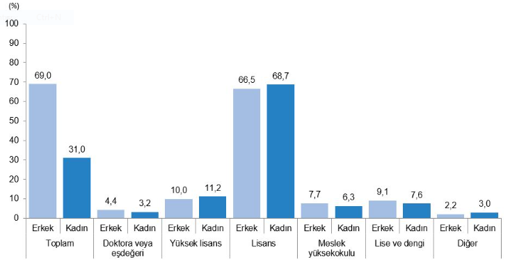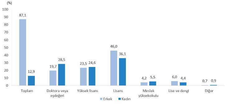 Kadınlarda ise en yüksek pay lisans mezunlarında (%36,1) olup, bunu doktora veya eşdeğeri (%28,5) ve yüksek lisans (%24,6) takip etmektedir.