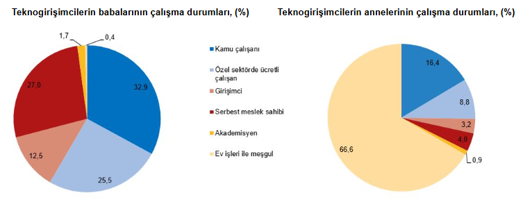 Teknogirişim kurucu ortağı veya en yüksek paya sahip aktif ortaklarının annelerinin %66,6'sının ev işleri ile meşgul olduğu görüldü. Annelerin meslek grupları incelendiğinde, en yaygın meslek grubunun %16,4 ile kamu çalışanları olduğu, bunu sırasıyla, özel sektörde ücretli çalışanlar (%8,8), serbest meslek sahipleri (%4,0), girişimciler (%3,2) ve akademisyenlerin (%0,9) takip ettiği görüldü.
