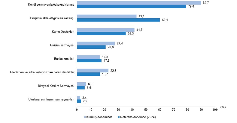 Teknogirişimlerin kuruluş döneminde ve 2024 yılı içerisinde en önemli finansman kaynakları ayrı ayrı incelendi. Teknogirişimler için kuruluş döneminde kendi sermayesi/özkaynakları %89,7 ile en önemli finansman kaynağı olurken, bu oran referans dönemde %79,0 oldu.