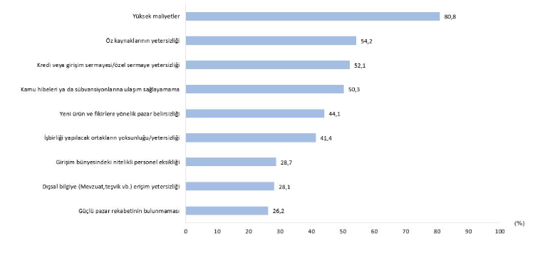 Teknogirişimin kuruluşundan itibaren gerçekleştirdiği faaliyetlerde en önemli engelleyici faktör olarak yüksek maliyetler %80,8 ile ilk sırada yer aldı. Bunu %54,2 ile özkaynakların yetersizliği, %52,1 ile kredi veya girişim sermayesi/özel sermaye yetersizliği, %50,3 ile kamu hibeleri ya da sübvansiyonlarına ulaşım sağlayamama takip etti.