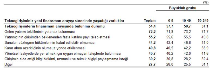 Yeni finansman arayışında bulunan teknogirişimlerin payı %54,4 olurken bu teknogirişimlerin %72,2'si gelen yatırım tekliflerini yetersiz buldu. Yeni finansman arayışında bulunan teknogirişimlerin zorluk yaşadığı diğer alanlar; %55,2 ile yatırımcının girişimden beklenenden fazla katılım payı talep etmesi, %44,2 ile sunulan sözleşme hükümlerinin kabul edilebilir olmaması, %40,8 ile karar alma özerkliğinin olumsuz yönde etkilenmesi oldu.