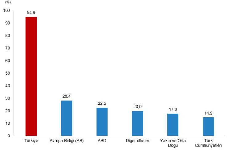 Teknogirişimlerin 2024 yılında İnternet (web siteleri ya da mobil uygulamalar) aracılığı ile gerçekleştirdikleri e-satış oranları coğrafi bölge dağılımına göre incelendiğinde; e-satış yapan teknogirişimlerin %94,9'u yurt içine e-satış yaptığını ifade etti. Bunu; %28,4 ile Avrupa Birliği (AB) ülkeleri, %22,5 ile Amerika Birleşik Devletleri (ABD), %20,0 ile diğer ülkeler, %17,8 ile Yakın ve Orta Doğu ülkeleri ve %14,9 ile Türk Cumhuriyetleri takip etti.