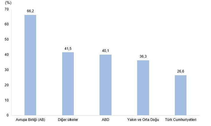 İhracat yapan teknogirişimlerin %66,2'si AB ülkelerine, %41,5'i diğer ülkelere, %40,1'i ABD'ye, %36,3'ü Yakın ve Orta Doğu ülkelerine ve %26,6'sı Türk Cumhuriyetleri'ne ihracat gerçekleştirdi.