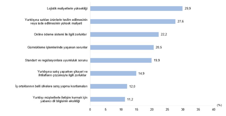 2024 yılında ihracat gerçekleştiren teknogirişimlerin yaşadığı zorlukların başında %29,9 ile lojistik maliyetlerin yüksekliği geldi. Bunu; yurtdışına satılan ürünlerin teslim edilmesinin veya iade edilmesinin yüksek maliyeti (%27,6), online ödeme sistemi ile ilgili zorluklar (%22,2), gümrükleme işlemlerinde yaşanan sorunlar (%20,5) ve standart ve regülasyonlara uyumluluk sorunu (%19,9) izledi.