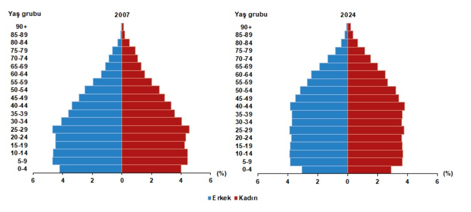 Yaş gruplarına göre nüfus oranı, 2007, 2024