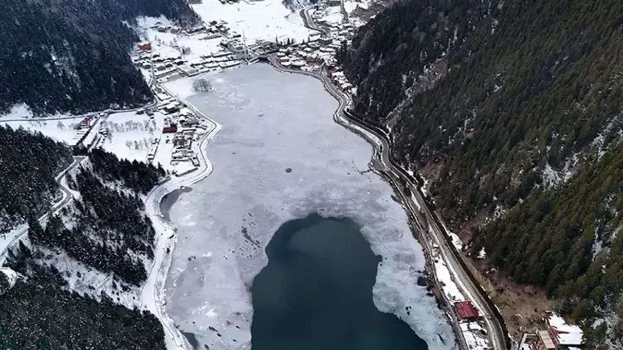 Ortaya çıkan seyirlik manzara dronla görüntülendi.Çaykara ilçesine 20 kilometre uzaklıkta, denizden 1250 metre yükseklikte yer alan, doğal güzelliğiyle Doğu Karadeniz'in turizm merkezi Uzungöl, yağan karla beyaz örtüyle kaplandı.