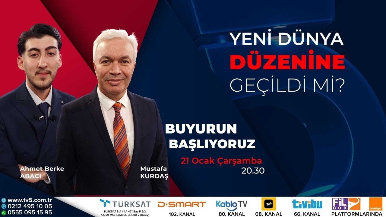 Buyurun Başlıyoruz Buyurun Başlıyoruz – 21.01.2026 🔴#CANLI | Yeni Dünya Düzenine Geçildi Mi? – Buyurun Başlıyoruz – Ahmet Berke Abacı – Mustafa Kurdaş 21.01.2026 - 21:10 21.01.2026 - 21:10 Abone Ol Gelişmelerden haberdar olmak istiyor musunuz? Google News’te TV5 sitemize abone olun. Abone Ol