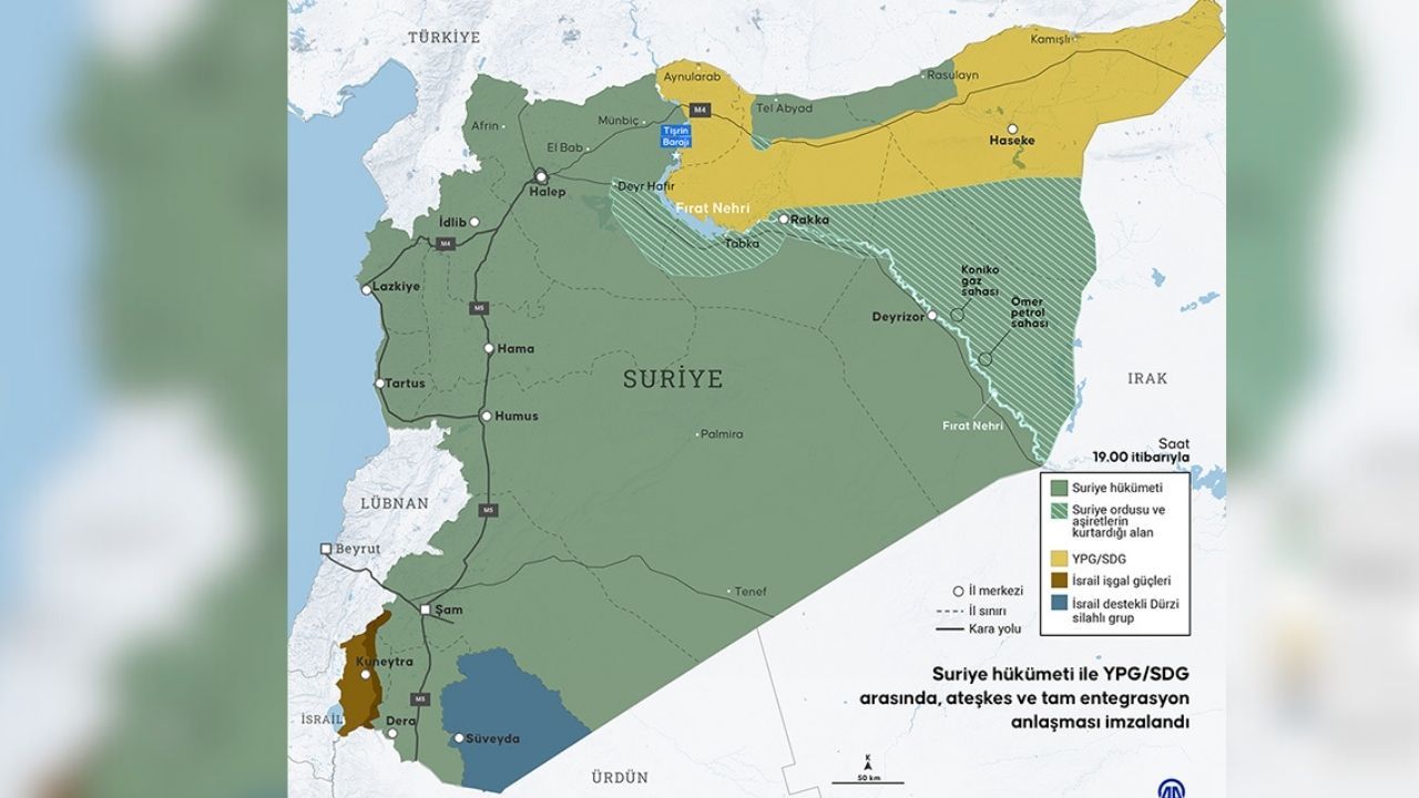 Şam yönetiminden 18 Ocak'ta yerel saatle 18.00'de yapılan yazılı açıklamada, Suriye Cumhurbaşkanı Ahmed Şara'nın terör örgütü YPG/SDG ile ateşkes ve örgütün tam entegrasyonunu kapsayan bir anlaşmayı imzaladığı duyuruldu.