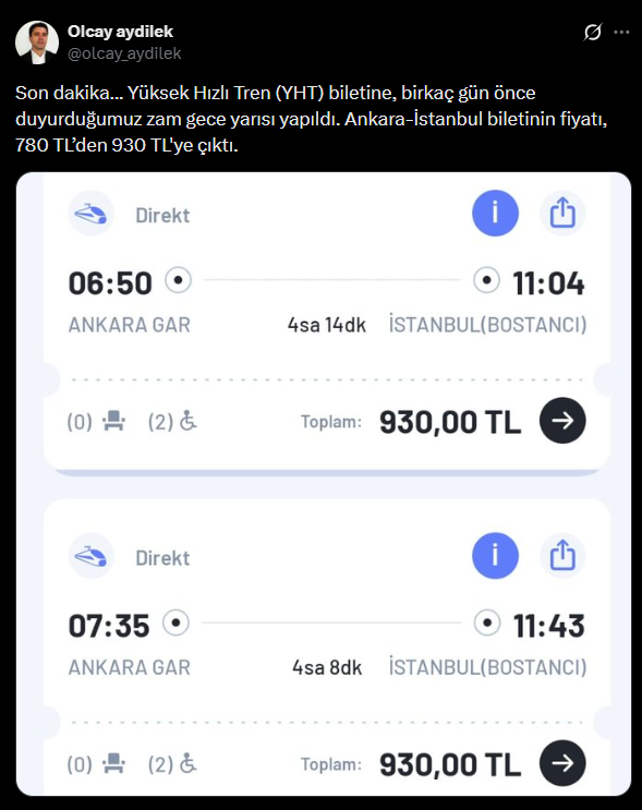 Zam oranı yüzde 19,23 olurken, yarıyıl tatili öncesinde gelen artış dikkat çekti. Zamlı tarifeye göre Ankara-İstanbul hattında bilet fiyatı 780 TL’den 930 TL’ye çıktı.