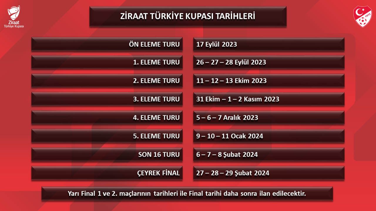 2023-2024 Türkiye Kupası’nda maç tarihleri ve kulüplerin turlara göre katılım durumları açıklandı. Türkiye Futbol Federasyonu’ndan (TFF) yapılan açıklamaya göre; ön eleme turu 17 Eylül 2023, 1’inci ön eleme turu 26-27-28 Eylül 2023, 2’nci ön eleme turu 11-12-13 Ekim 2023, 3’üncü eleme turu 31 Ekim / 1-2 Kasım 2023, 4’üncü eleme turu 5,6,7 Aralık 2023, 5’inci ön elem turu 9-10-11 Ocak 2024, son 16 turu 6,7,8 Şubat 2024 ve çeyrek final müsabakaları 27,28,29 Şubat 2024 tarihleri arasında yapılacak. Yarı final ve final karşılaşmasının tarihleri ise daha sonra ilan edileceği belirtildi.